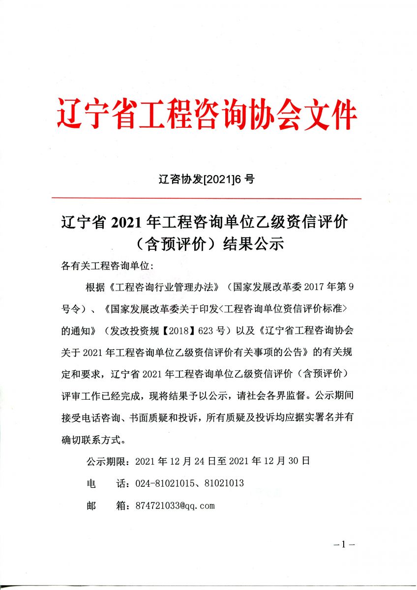 遼寧省2021年工程咨詢單位乙級資信評價(含預評價)結果公示