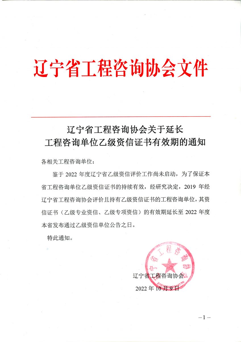 遼寧省工程咨詢協會關于延長工程咨詢單位乙級資信證書有效期的通知