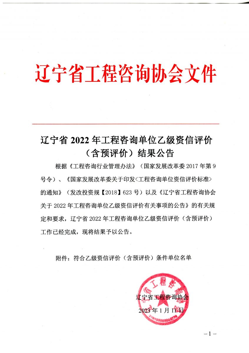 遼寧省2022年工程咨詢單位乙級資信評價(含預評價)結果公告