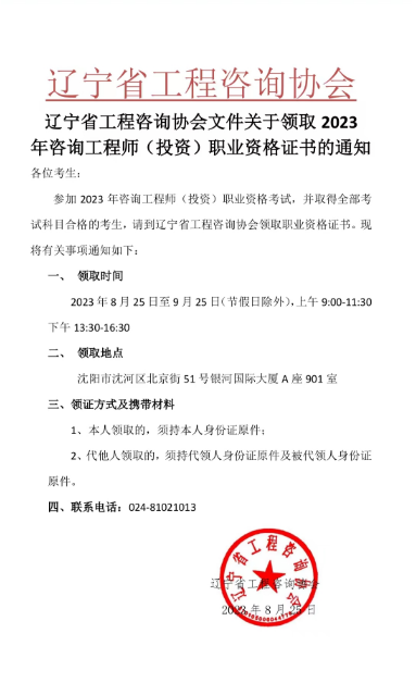 遼寧省工程咨詢協會文件關于領取2023 年咨詢工程師(投資)職業資格證書的通知