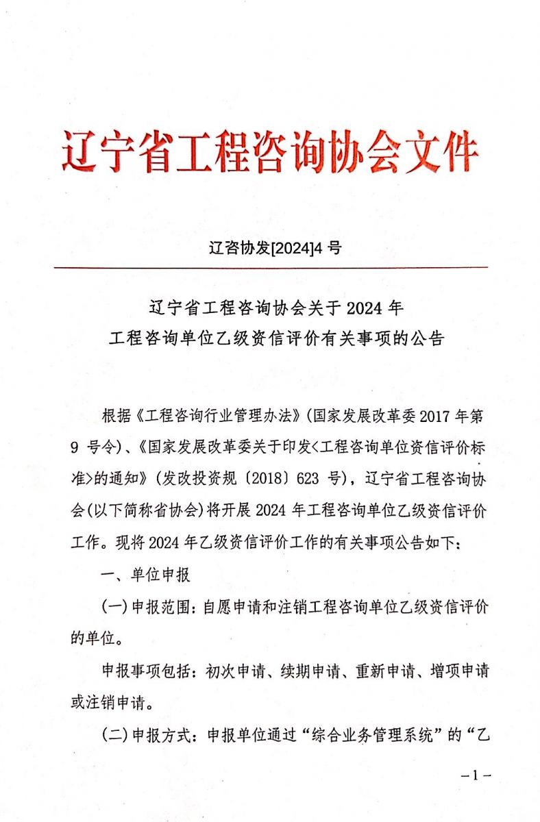 遼寧省工程咨詢協會關于2024年工程咨詢單位乙級資信評價有關事項的公告