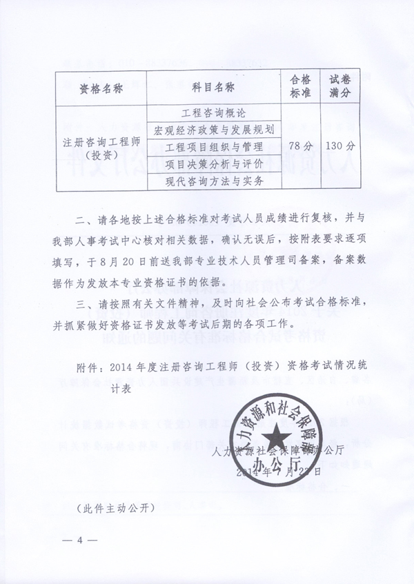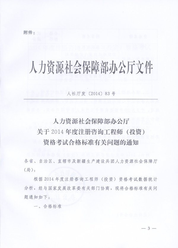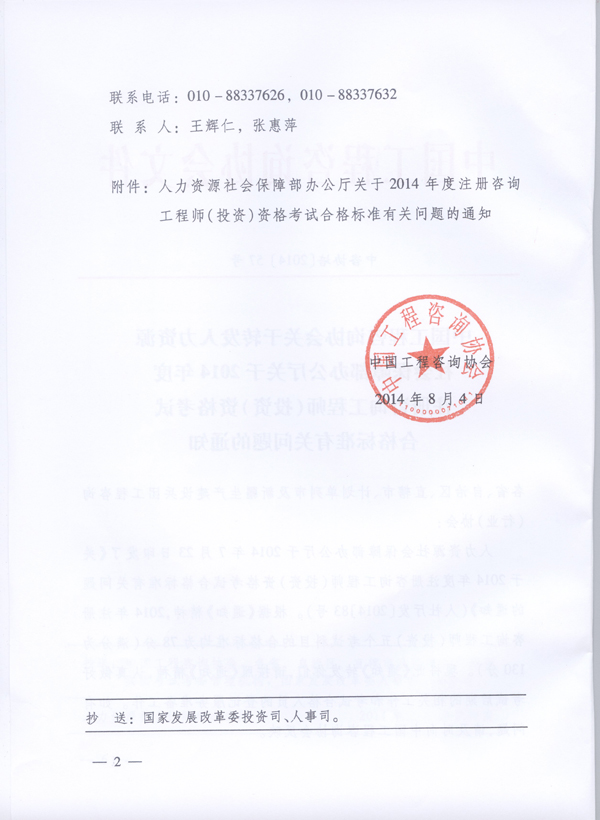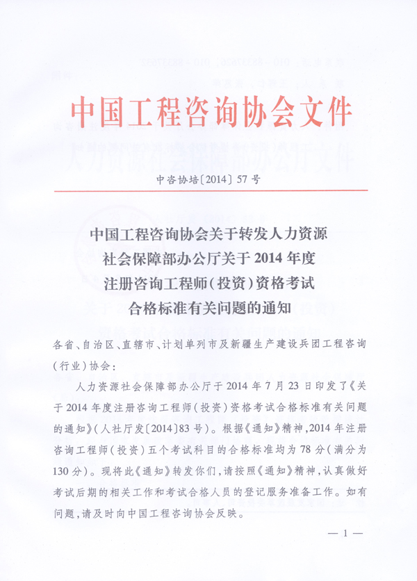 中國工程咨詢協(xié)會關(guān)于轉(zhuǎn)發(fā)人力資源社會保障部辦公廳關(guān)于2014年度注冊咨詢工程師(投資)資格考試合格標準有關(guān)問題的通知