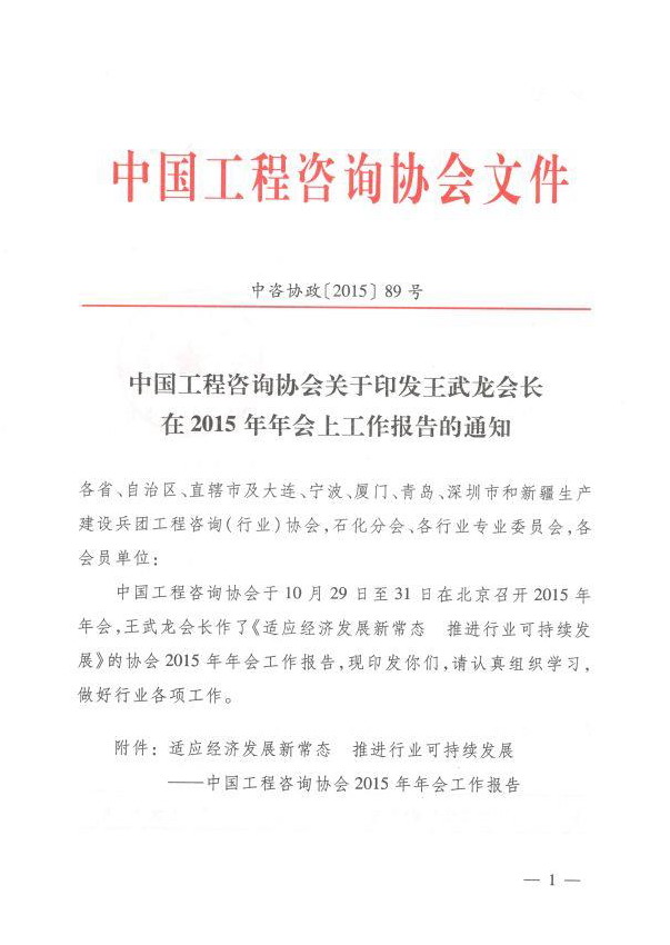 中國工程咨詢協會關于印發王武龍會長在2015年年會上工作報告的通知