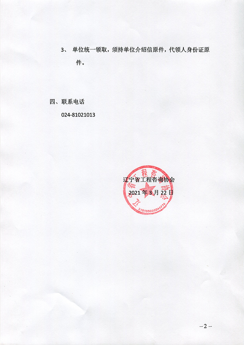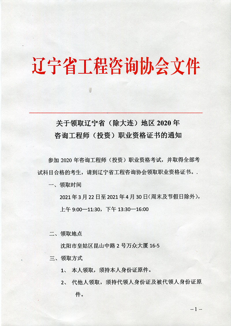 關于領取遼寧省(除大連)地區2020年咨詢工程師(投資)職業資格證書的通知